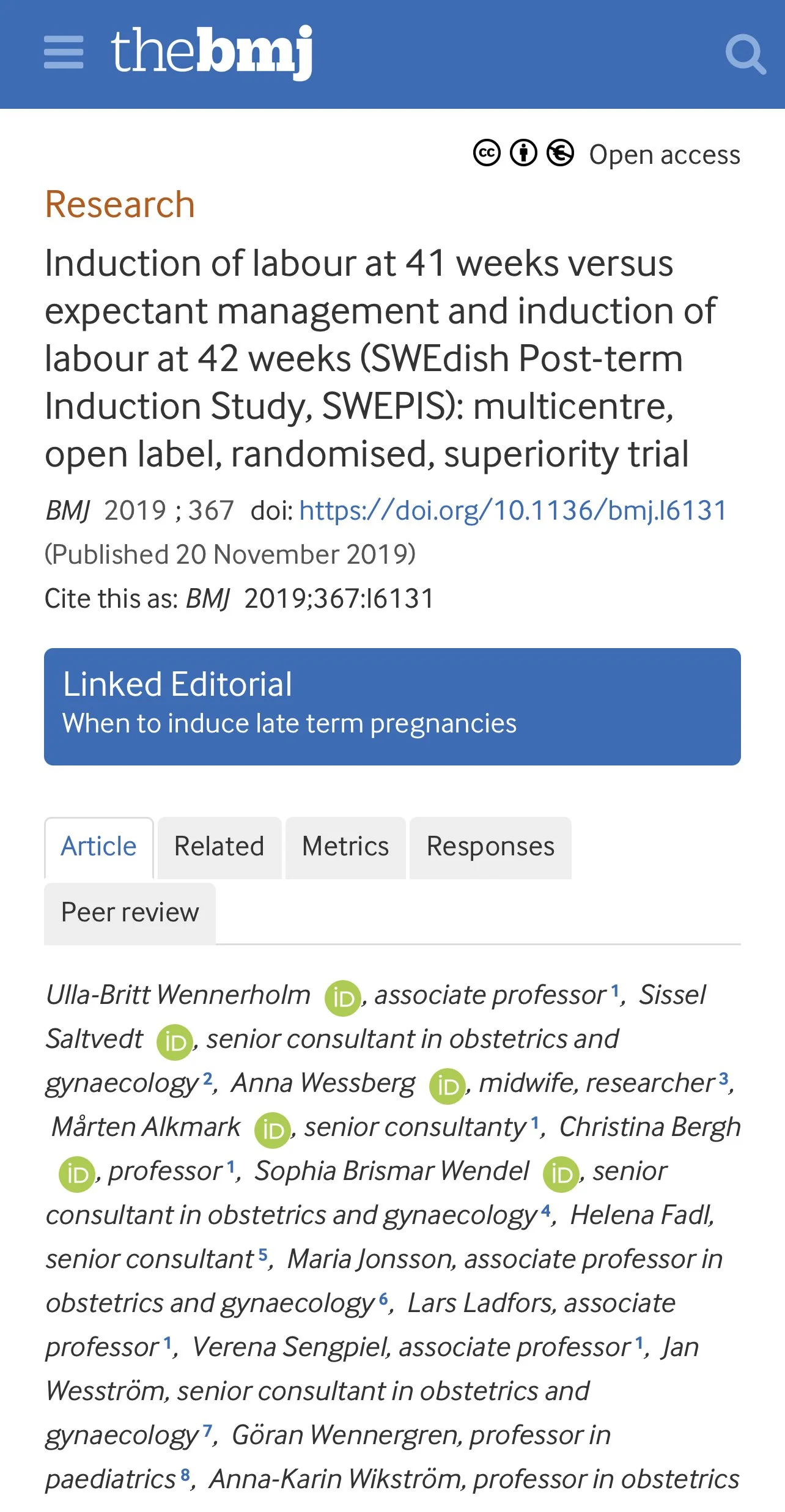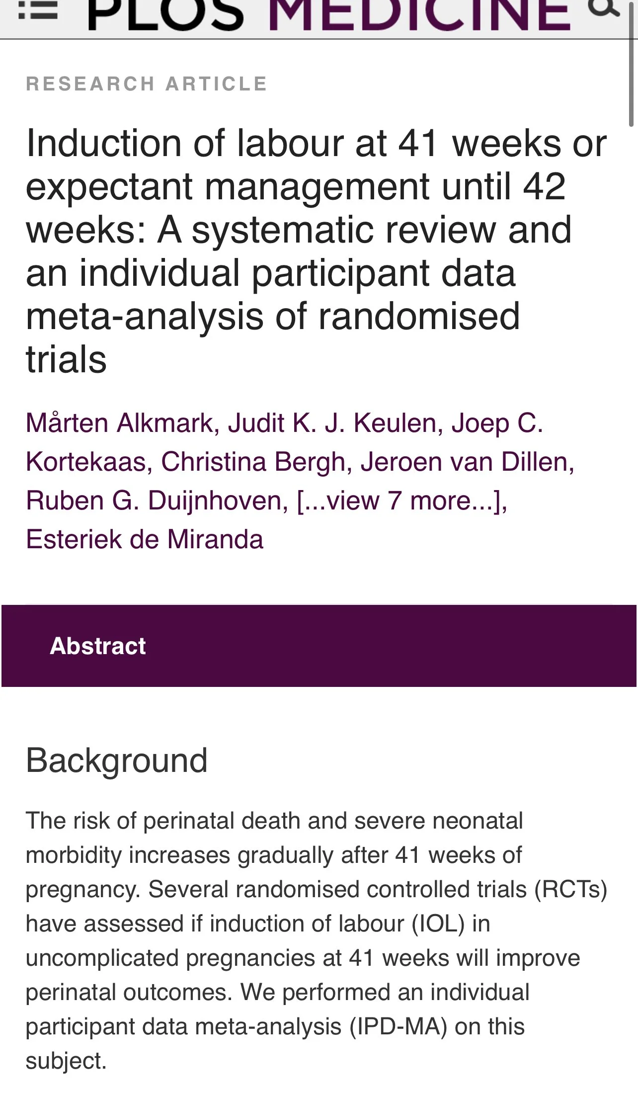 A lower risk of stillbirth was found in the 2019 Swedish SWEPIS is study too. It compared 41 vs 42 weeks for IOL. There were no neonatal deaths in the 41-week IOL group vs 6 in the 42-weeks IOL group. No difference in caesarean section or assisted birth -vacuum or forceps. It was believed to be unethical to continue the study due to the clear benefit of IOL at 41 weeks, and it was stopped early.